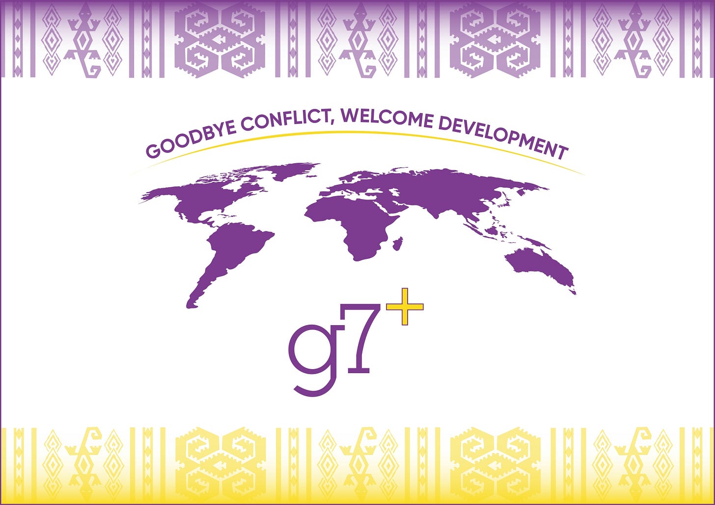 Il n’en est rien. Loin des fastes et splendeurs protocolaires de son quasi-homonyme, le g7+ est un organisme intergouvernemental qui réunit des États en développement en situation de fragilité ou affectés par des conflits. Créé en 2010 par sept États et fort aujourd’hui d’une vingtaine de membres d’Afrique, des Caraïbes et du Pacifique, le g7+ offre à ses membres une plateforme commune pour promouvoir une coopération efficace fondée sur l’appropriation nationale, des partenariats de développement plus équilibrés et un partage d’expériences mutuelles en matière de règlement des conflits et de stabilisation.